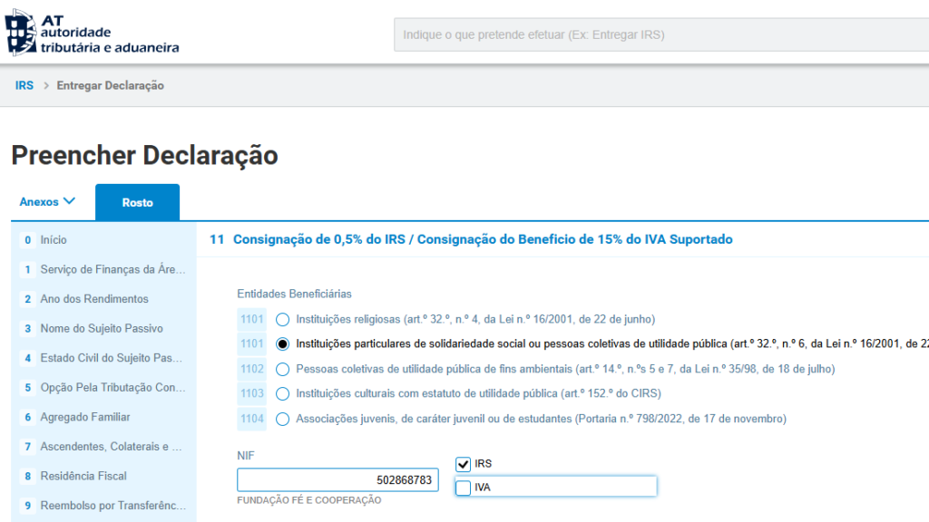 - Assinalar a opção “Consignar 1% do IRS”;